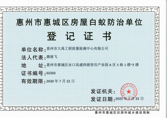 近日,惠州水務(wù)集團(tuán)大禹檢測(cè)公司順利拿下廣東省住房和城鄉(xiāng)建設(shè)廳頒發(fā)的建設(shè)工程質(zhì)量檢測(cè)機(jī)構(gòu)資質(zhì)證書(shū)(編號(hào):(粵)建檢專(zhuān)字第20250046號(hào)),資質(zhì)范圍覆蓋建筑材料及構(gòu)配件、主體結(jié)構(gòu)及裝飾裝修、鋼結(jié)構(gòu)、地基基礎(chǔ)、市政工程材料、道路工程等六大專(zhuān)項(xiàng),突顯大禹檢測(cè)公司在建設(shè)工程質(zhì)量檢測(cè)領(lǐng)域的整體實(shí)力邁上新高度;同步獲惠州市惠城區(qū)住房和城鄉(xiāng)建設(shè)局頒發(fā)的房屋白蟻防治單位登記證書(shū)(編號(hào):02260)。至此,公司成為惠州少數(shù)具備“檢測(cè)+防治”一體化服務(wù)能力的機(jī)構(gòu)。