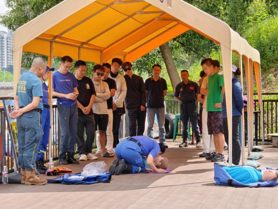 藍(lán)天救援隊(duì)結(jié)合近期發(fā)生的溺水和救援案例,現(xiàn)場拆解“黃金四分鐘”,他們帶領(lǐng)景區(qū)和經(jīng)營業(yè)態(tài)工作人員分組練習(xí),從清理呼吸道、開放氣道到精準(zhǔn)按壓,逐一糾正手勢偏差。全域覆蓋從“專業(yè)隊(duì)”到“全員兵”的安全共識。接著,槳板運(yùn)動協(xié)會與藍(lán)天救援隊(duì)分別對槳板救援、繩包救援、徒手救援等進(jìn)行了系統(tǒng)化的培訓(xùn),景區(qū)內(nèi)各業(yè)態(tài)的工作人員也積極地參與了救援實(shí)踐的學(xué)習(xí)。