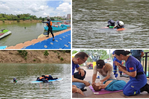 8月22日上午9時(shí),桃花源游客服務(wù)中心聯(lián)合惠州市藍(lán)天救援隊(duì)、惠州市槳板運(yùn)動協(xié)會在桃花源水上運(yùn)動中心開展“防溺水專項(xiàng)應(yīng)急演練”。此次演練統(tǒng)籌組織了景區(qū)保安、水上項(xiàng)目全體員工、經(jīng)營業(yè)態(tài)負(fù)責(zé)人等30余人,圍繞“發(fā)現(xiàn)—呼救—救援—醫(yī)療”全鏈條開展實(shí)戰(zhàn)化水上安全救援演練。