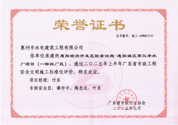 近日,由惠州水務(wù)集團水電公司承建的惠陽經(jīng)濟開發(fā)區(qū)配套設(shè)施—惠陽城區(qū)第三凈水廠項目(一標(biāo)段廠區(qū)),順利通過2025年上半年“廣東省市政工程安全文明施工標(biāo)準(zhǔn)化”評價。這一榮譽不僅是對市水電公司項目管理與施工水平的高度肯定,更是對他們始終堅持高標(biāo)準(zhǔn)、嚴(yán)要求推進安全文明施工的生動詮釋,為行業(yè)樹立了可借鑒、可推廣的標(biāo)桿典范。