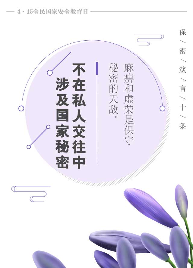 4個(gè)全民國(guó)家安全教育日。國(guó)家利益高于一切,國(guó)家安全人人有責(zé),希望大家將警鐘長(zhǎng)鳴耳邊,將保密牢記心間,現(xiàn)推出十條“保密箴言”。