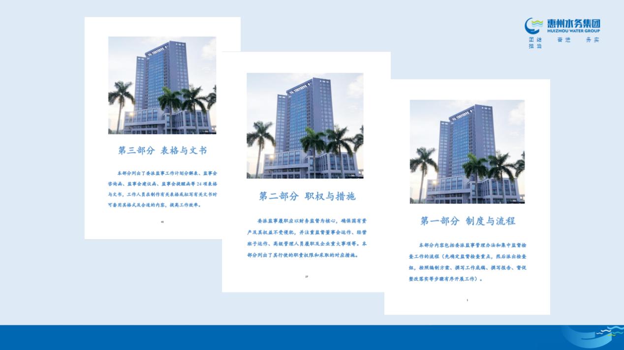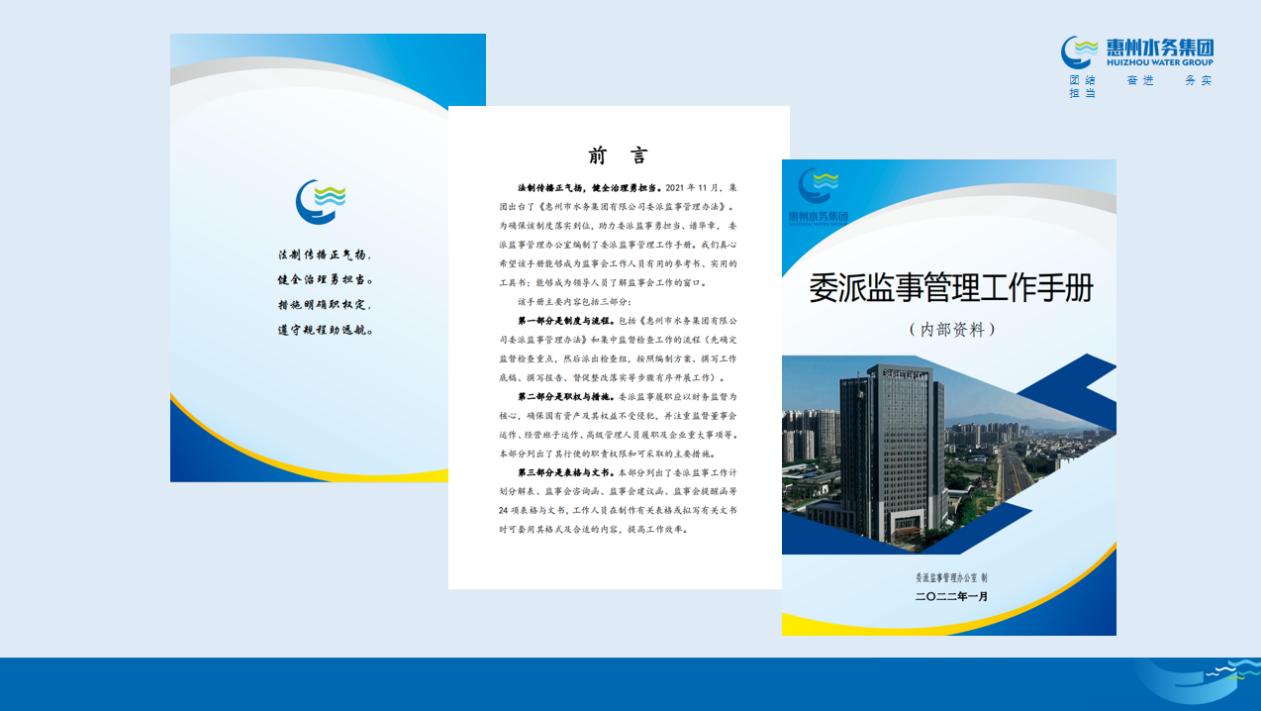 會上,與會人員對近期重點工作、監(jiān)事會運作及《委派監(jiān)事管理工作手冊》等進行了探討。《委派監(jiān)事管理工作手冊》是為確保2021年11月集團出臺的《惠州市水務集團有限公司委派監(jiān)事管理辦法》落實到位,助力委派監(jiān)事勇?lián)?、譜華章,由集團監(jiān)察審計部負責編制的,該手冊主要內容包括制度、流程、職權、措施、表格、文書等。
